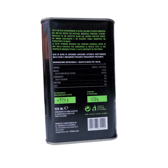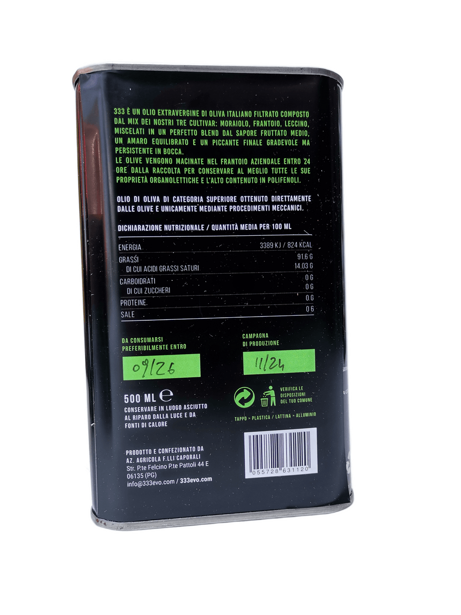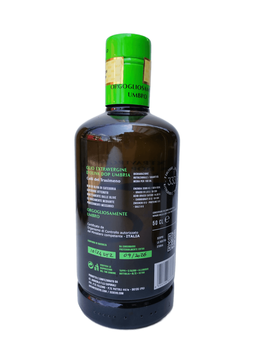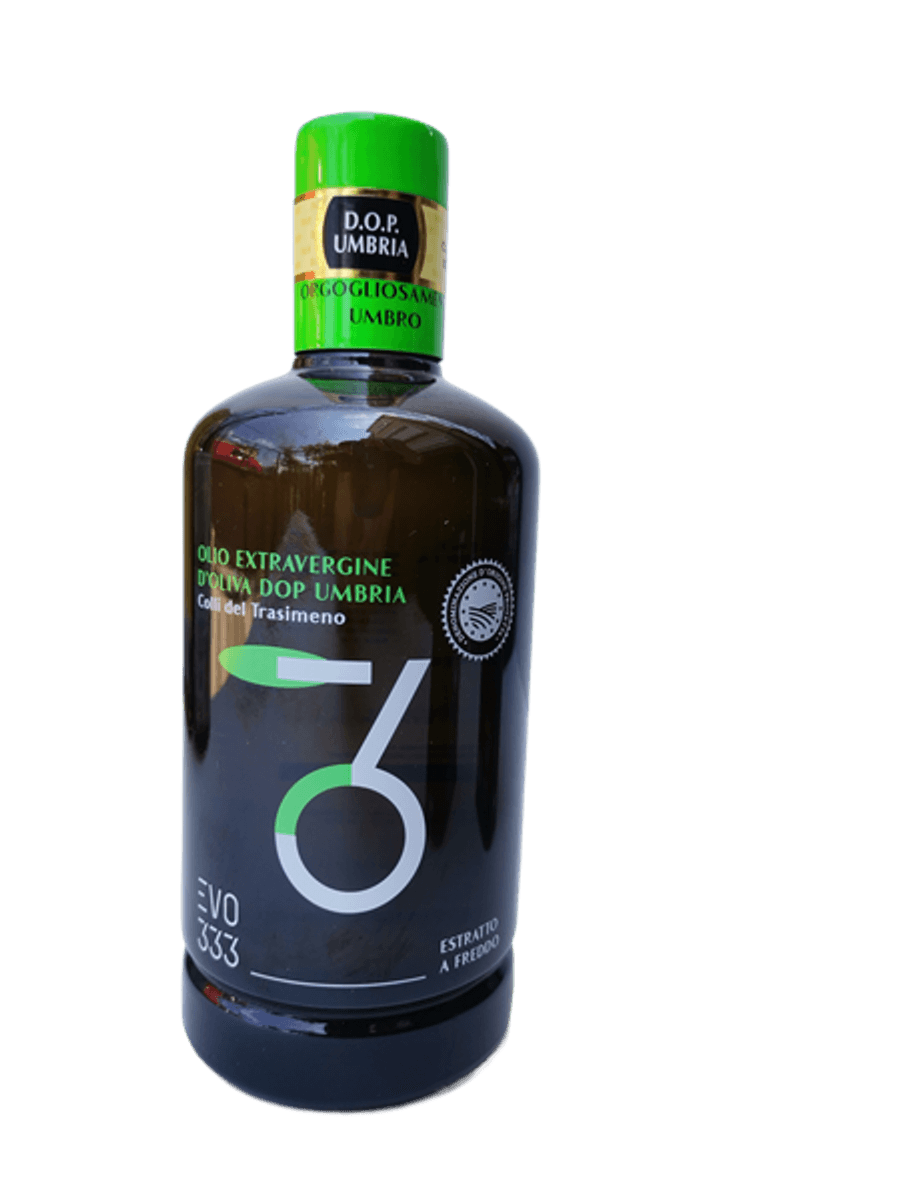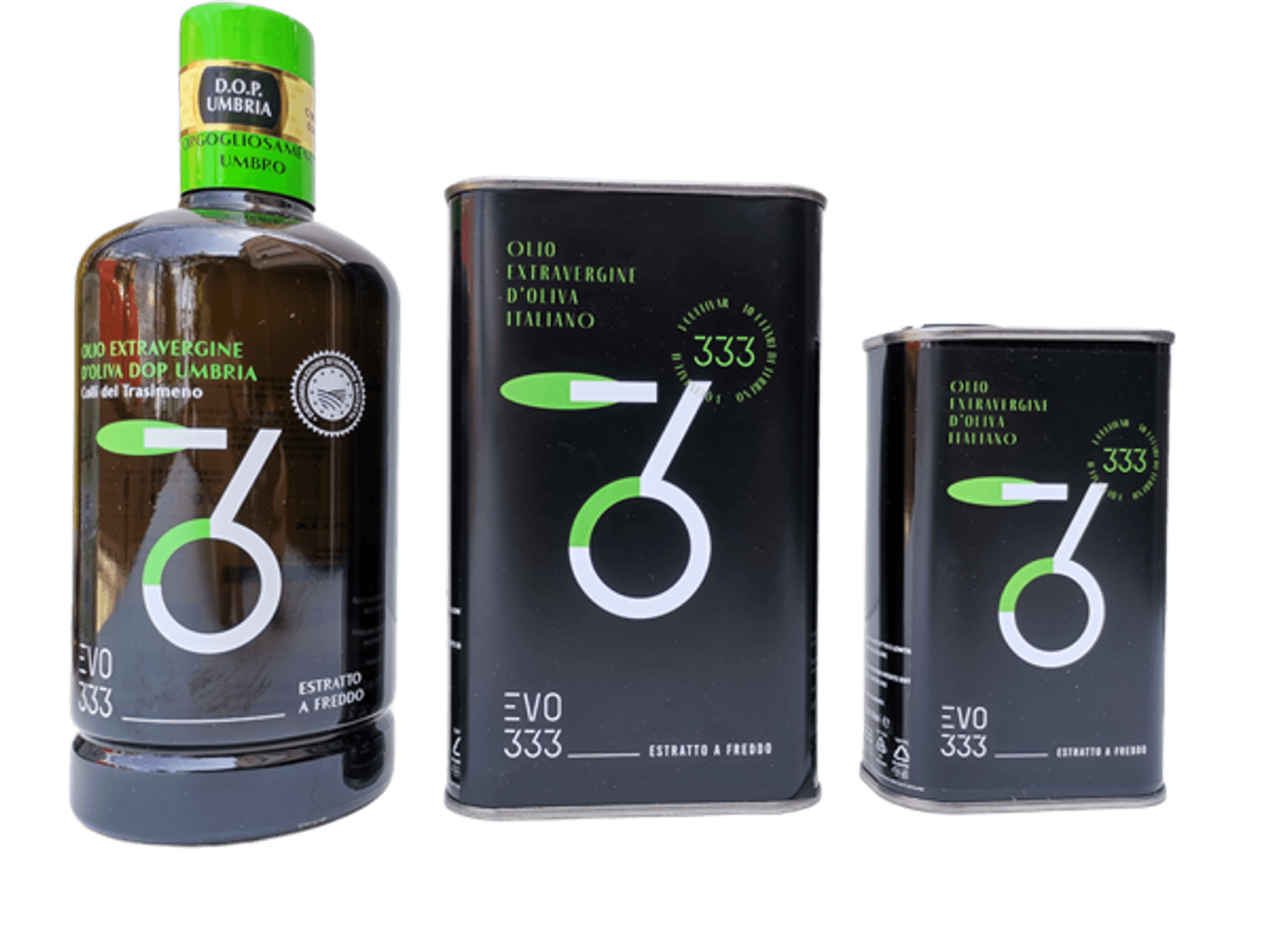 Предлага се в лимитирана серия (2000 бутилки) и е опакован в ексклузивна бутилка, запазвайки качеството на нашето зелено злато. Открийте EVO 333 , нашия екстра върджин зехтин Umbria Colli del Trasimeno DOP , символ на италианското съвършенство и умбриянската традиция в производството на зехтин. Произведено по занаятчийски начин от подбрани маслини, това сертифицирано по DOP EVO масло гарантира автентичен вкус, богат на характер, интензивни аромати и най-високо качество. Бутилката EVO 333, създадена в сътрудничество със Saida Group , е част от линията Horizon , проектирана да съхрани най-добре това зелено злато. Тя е със ситопечат и е с капачка за еднократна употреба, която не пропуска, за да се избегне разхищението.